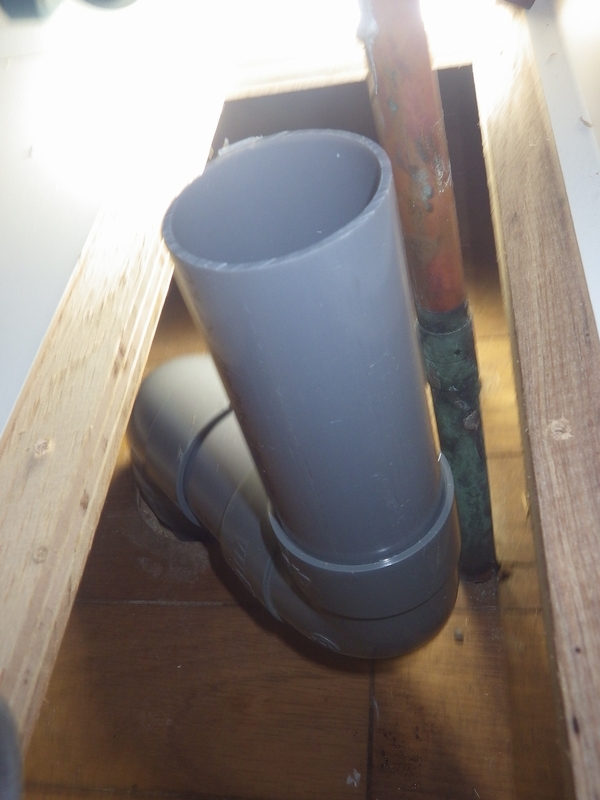 点検口の下板を外してみると 排水管の接続箇所が真下ではなく 左側手前にあって ジャバラ管で差し込んでいました