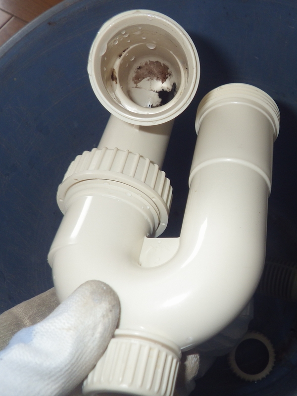 まずはトラップ部分を取り外して詰まっている異物(ヌルヌルとした付着物)を除去して水洗い