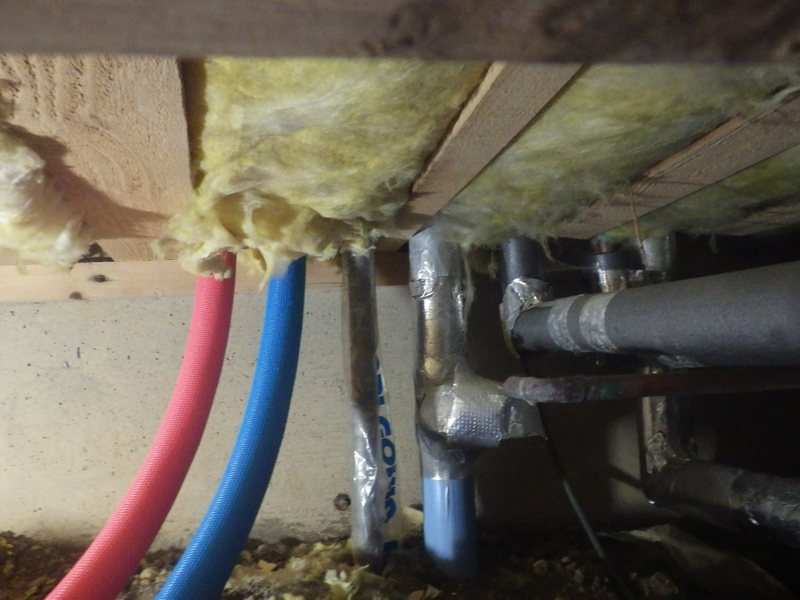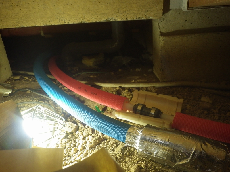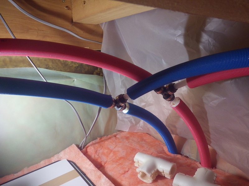 給水管と給湯管の分岐接続 給湯機から流し台への配管からシャワー系統の分岐