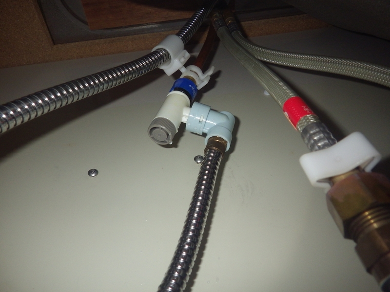 取替えるには水・湯を止めなければなりませんが あいにく止水弁が設けてないので 床下へ入って大元の給水バルブで止水